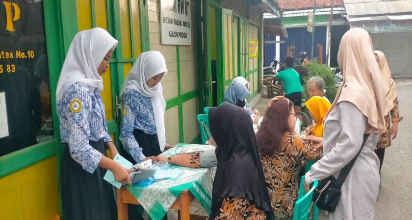 Pelayanan kesehatan yang dilakukan meliputi cek tekanan darah, cek, gula darah, cek asam urat, dan cek kadar kolesterol. Petugas kesehatan yg bertugas adalah Ibu Diah Rohmah Hidayah, Amd.,Kep. dan Ibu Nesti C, S.Kep. dibantu oleh 2 siswa keperawatan yakni Meilani Eka Putri dan Okta Fitri dari kelas XII Keperawatan.